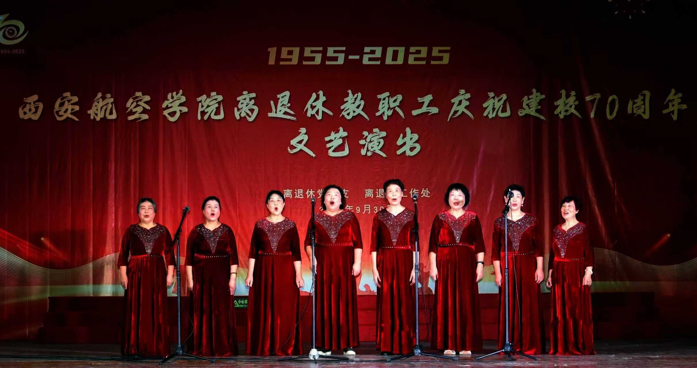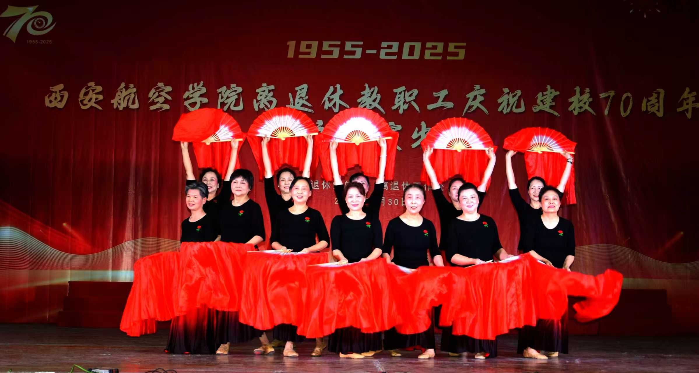 七秩华诞,桑榆献礼。9月30日,学校莲湖校区大学生活动中心华灯璀璨、喜气盈盈。学校党委副书记宁永录,桃园街道延光社区党工委书记贺君,学校党政办公室、党委组织部、人事处等部门负责人,以及师生代表和离退休教职工、家属等200余人齐聚一堂,以文艺汇演形式隆重庆祝国庆佳节和建校70周年。老同志们以歌抒怀,以舞寄情,共同见证学校七十年光辉历程,深情礼赞航空报国不朽篇章。