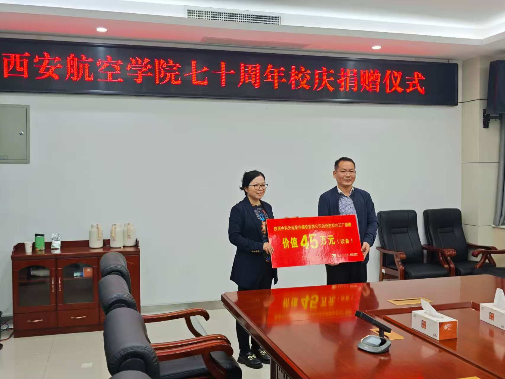 10月9日下午,西安航空学院阎良校区阎科楼第二会议室举行陕西中科天地航空模块有限公司捐赠仪式。西安航空学院党委副书记张昭、校办工厂厂长周华、副书记郝大鹏、副厂长樊万仓,陕西中科天地航空模块有限公司副总经理王小兰、生产部长王飞泽出席活动,仪式由周华主持。