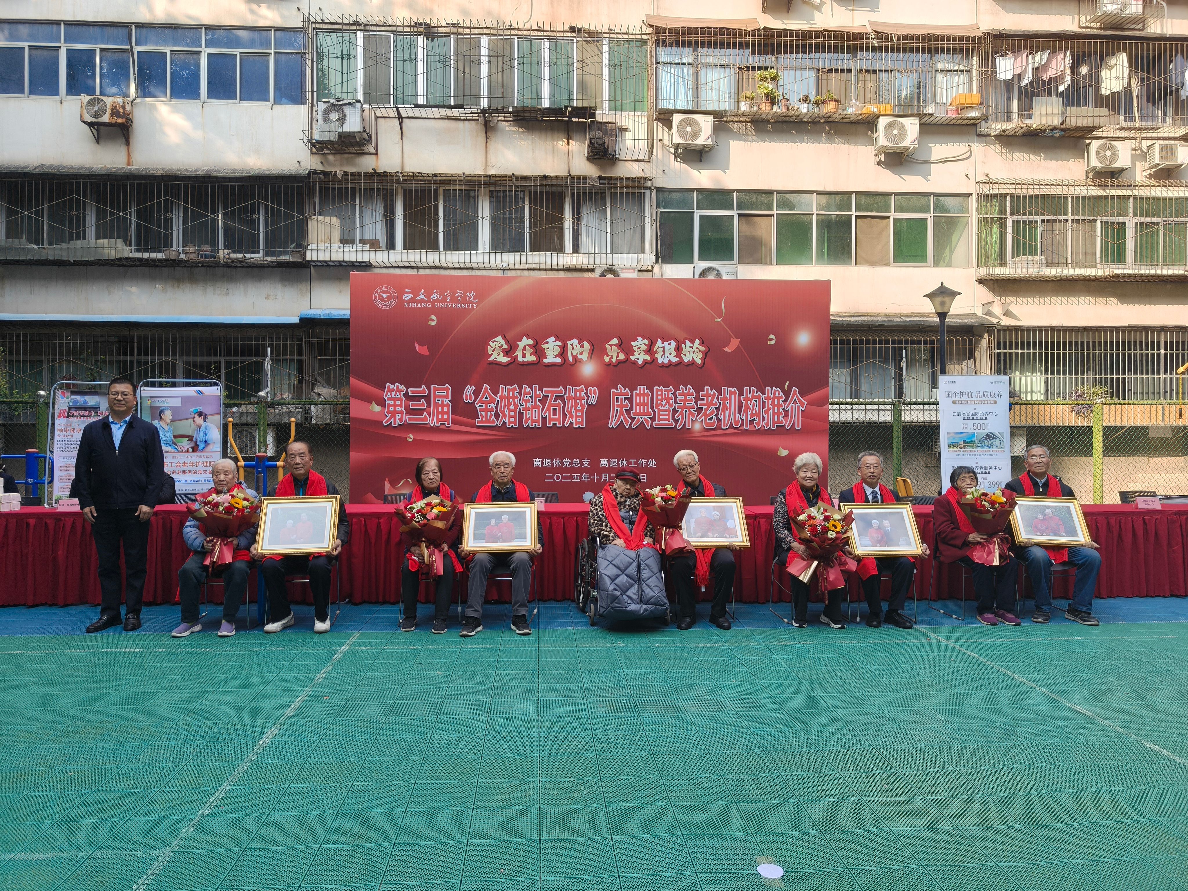 为弘扬中华民族尊老敬老传统美德,提升康养生活品质,10月28日“重阳节”前夕,我校成功举办“爱在重阳·乐享银龄”第三届金婚钻石婚庆典暨养老机构推介活动。党委副书记宁永录,“金婚钻石婚”代表,后勤保障处等职能部门负责人,莲湖校区各二级学院党总支书记,荣华乐养曲江老年公寓、白鹿溪谷国际颐养中心、西安市工会老年护理院等养老机构,以及离退休老同志和家属,师生志愿者等近200余人共庆金婚钻石婚,推进助老服务举措。离退休党总支书记逯红杰主持活动。