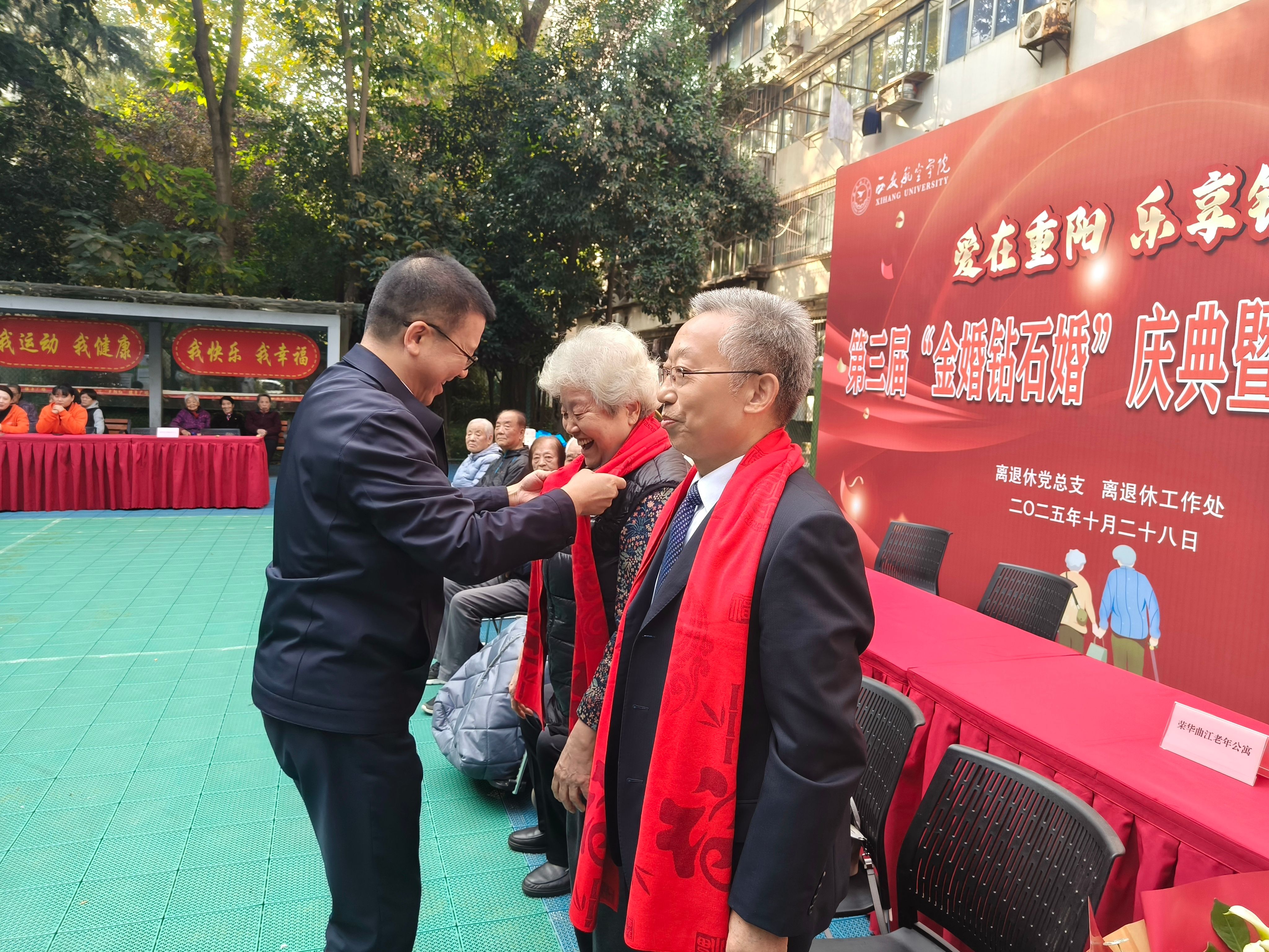 庆典活动在温馨的氛围中拉开帷幕。离退休工作处处长史正元介绍了学校2025年金婚、钻石婚夫妇代表。宁永录为“金婚钻石婚”夫妇佩戴喜庆围巾,送上祝福合影照及鲜花,代表学校表示崇高敬意和美好祝福。“金婚钻石婚”代表贾升祥分享了夫妻携手50年的温馨生活。互动环节还与现场观众学习了婚龄周年称谓的知识。离退休锅庄舞社团带来了精彩的锅庄舞表演,为活动增添了浓厚的喜庆氛围。