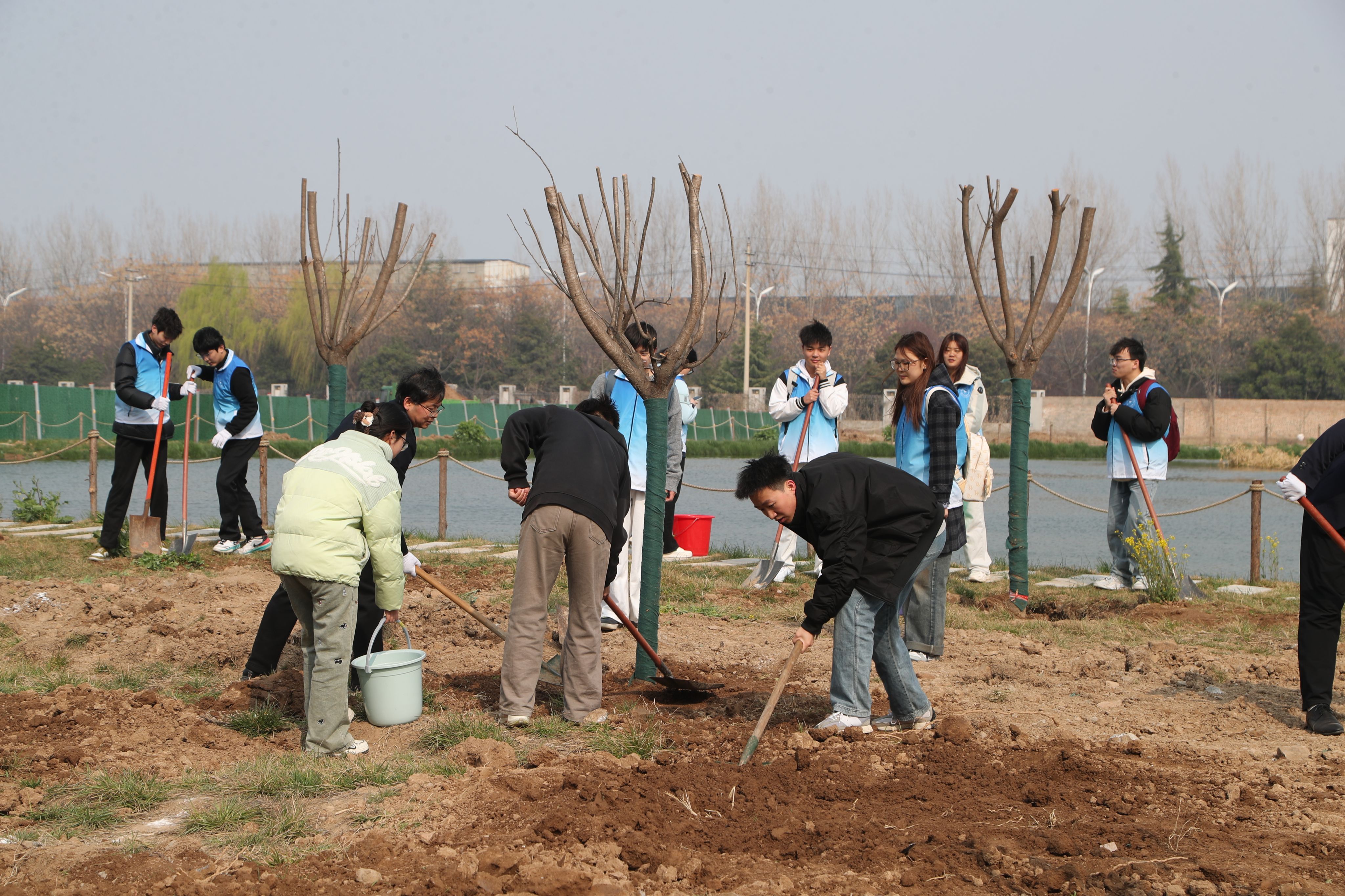 植树现场热火朝天。大家三五成组,默契配合——挥锹培土、扶正树苗、围堰夯实、提桶浇水,每一个动作都倾注着对绿色校园的深情寄望。经过一上午的辛勤劳作,100余株樱花苗木整齐挺立、迎风焕新,为初春的校园增添了一片勃勃生机。